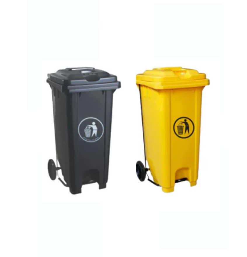 A durable 240-liter pedal bin with wheels, available in black or yellow for hygienic and mobile waste disposal.