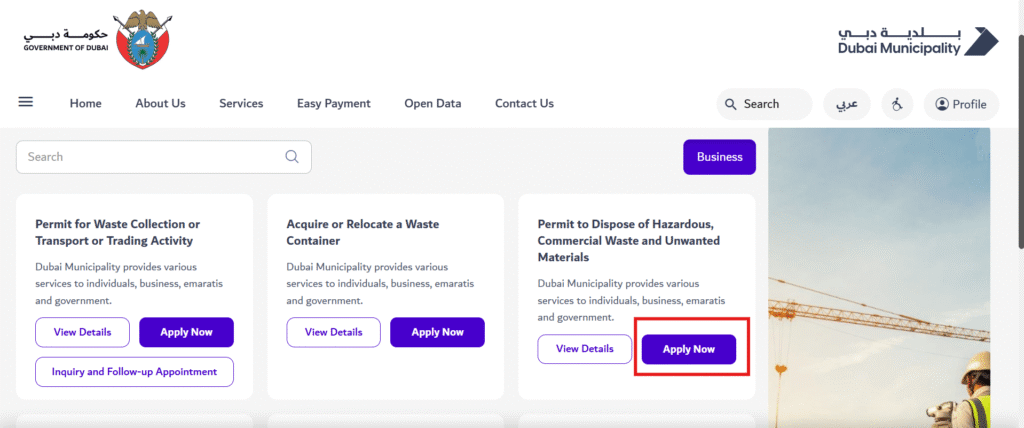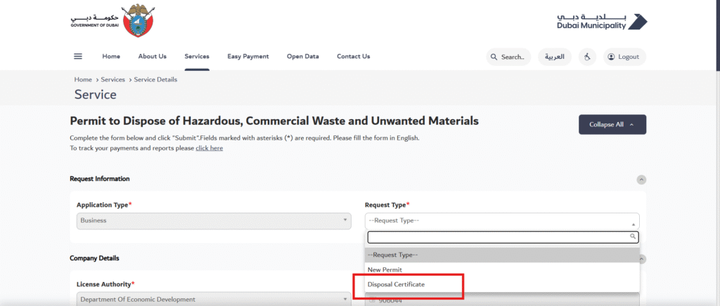 Click —-> Apply for a permit to dispose Hazardous and Commercial waste collection.