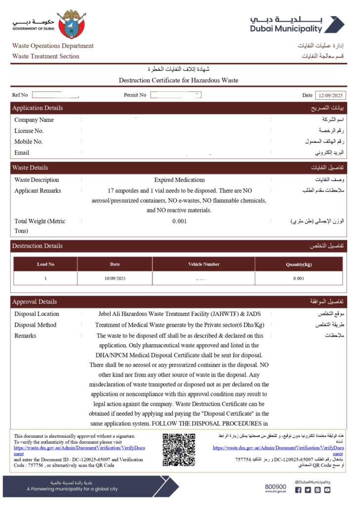 If you need to apply for a Disposal Certificate through Dubai Municipality, the process is straightforward but requires proper documentation. Applications are submitted online via the Dubai Municipality e-services portal. Once the request is reviewed, Dubai Municipality may conduct an inspection before approving the destruction. After completion, the official certificate is issued, serving as proof that the process was carried out in compliance with environmental and regulatory standards.